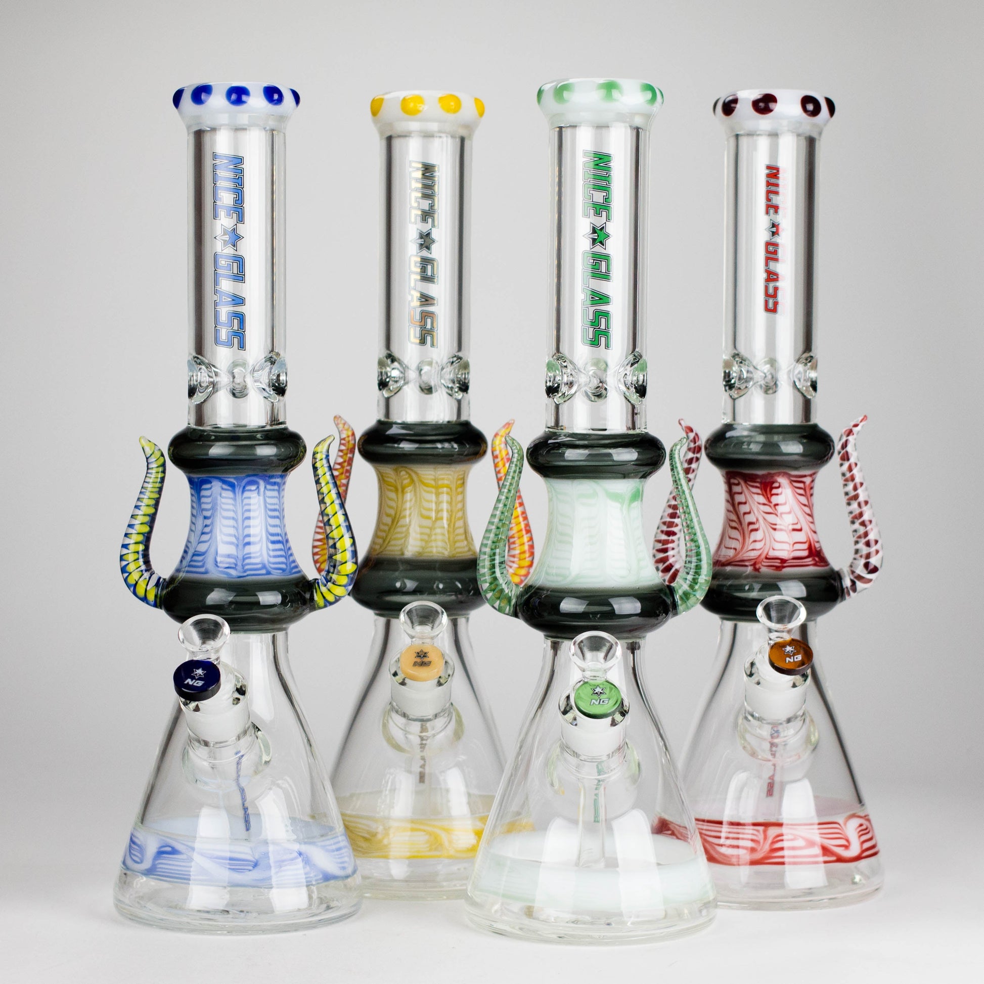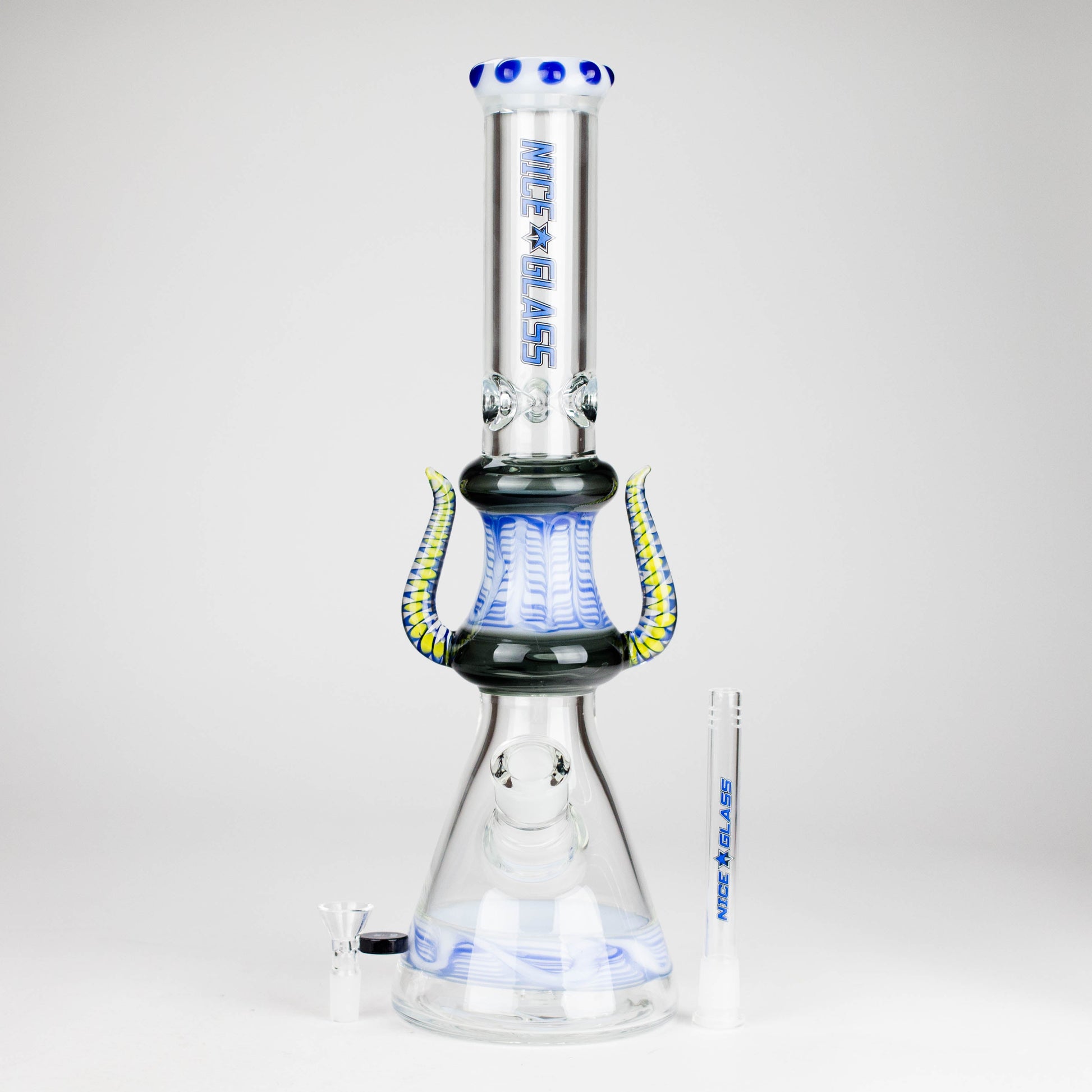 Turn your session into a work of art with the Nice Glass 17" Crowned Diablo Bong, featuring striking double glass horns and fumed accents for a bold, demonic look.